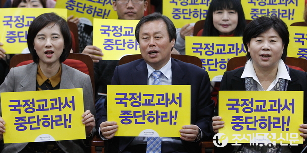 (조세금융신문=전한성 기자) 새정치민주연합 전국여성위원회가 주최하는 '역사교과서 국정화 저지를 위한 학부모 간담회 - 국정화 교과서 무엇이 문제인가?'가 20일 오전 서울 여의도 국회 의원회관에서 열린 가운데 새정치민주연합 유은혜(왼쪽부터), 도종환, 서영교 의원이 피켓을 들고 구호를 외치고 있다.