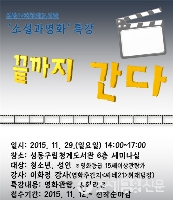(조세금융신문=옥정수 기자) 성동문화재단(이사장 정원오) 청계도서관이 오는 29일 오후 2시 소설과 영화 특강 「끝까지 간다」를 개최한다.