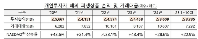 실제 2020년부터 올해(~10월)까지 개인투자자들은 해외 파생상품에서 연평균 약 4천490억원의 손실을 본 것으로 나타났다. 시장 등락과 무관하게 손실이 반복된 점이 특징적이다.