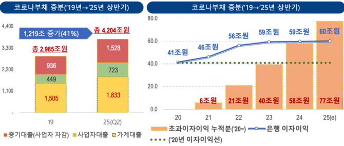 대기업 대출을 제외한 민간부채(중소기업대출, 사업자대출, 가계대출 포함) 잔액은 2019년 2,985조원에서 2025년 상반기 4,204조원으로 증가했다. 이 중 코로나19 이후 늘어난 대출 증가분만 1,219조원에 달한다.