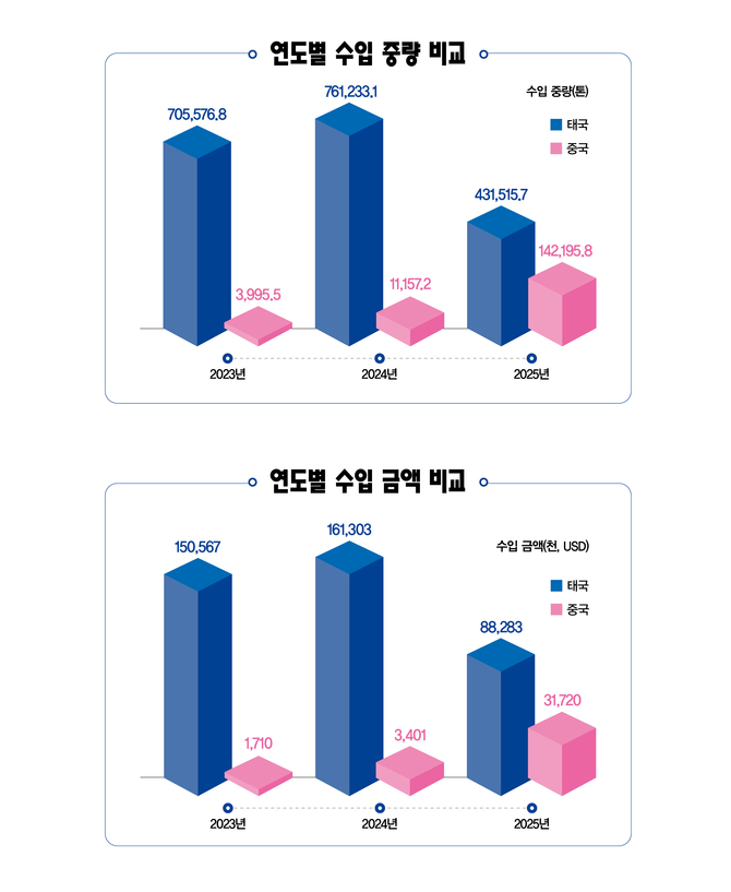 해당 관계자는 “전체 수입 물량 파이가 급격히 늘어난 것은 아니며, 필요한 물량 내에서 태국산의 빈자리를 중국산이 채우는 구조”라고 설명했다.