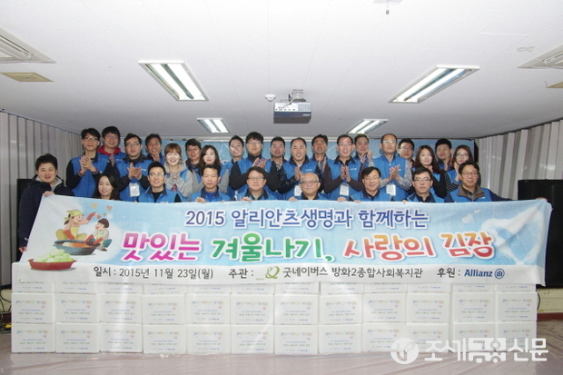(조세금융신문=옥정수 기자) 알리안츠생명은 서울 강서구 방화 3동에 위치한 ‘굿네이버스 방화2 종합사회복지관’에서 ‘맛있는 겨울나기, 사랑의 김장 봉사활동’을 펼쳤다고 25일 밝혔다.