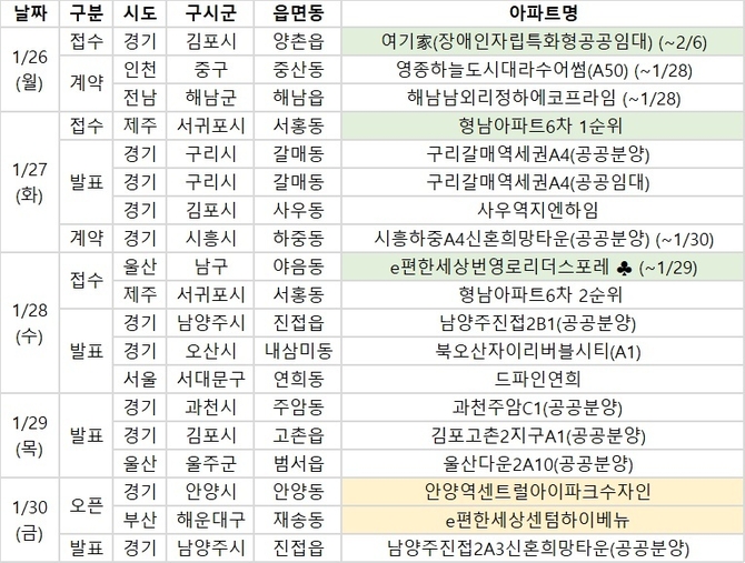 23일 부동산R114에 따르면 1월 넷째 주(1월 26~30일)에는 전국에서 분양에 나서는 단지는 3곳, 총 184가구에 불과하다. 청약보다는 안양·부산 등 주요 지역에서 모델하우스 오픈 단지에 수요자의 시선이 쏠릴 전망이다.