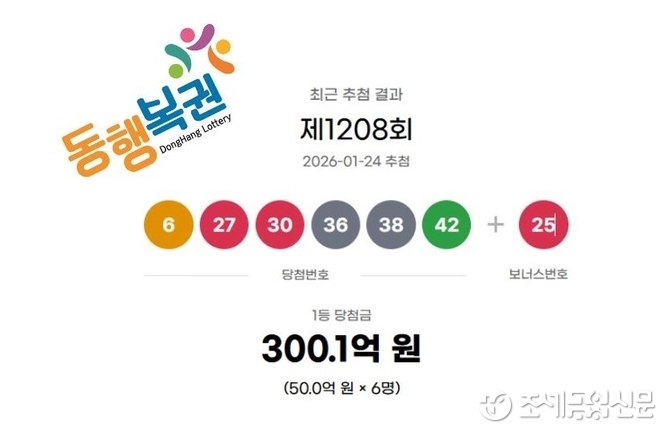 (조세금융신문=박청하 기자) 제1208회 로또복권 추첨에서 '6, 27, 30, 36, 38, 42'가 1등 당첨번호로 뽑혔다. 2등 보너스 번호는 '25'이다.