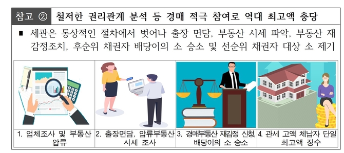 특히 주목할 만한 성과는 관세청 단일 체납 건 중 역대 최고액인 100억 원을 징수한 사례다. 세관은 고액 체납자의 압류 부동산을 대상으로 3년에 걸친 끈질긴 권리관계 분석과 경매 재감정을 실시했다. 이후 채권자 간 소송에 직접 참여해 승소함으로써 체납액을 전액 충당했다.