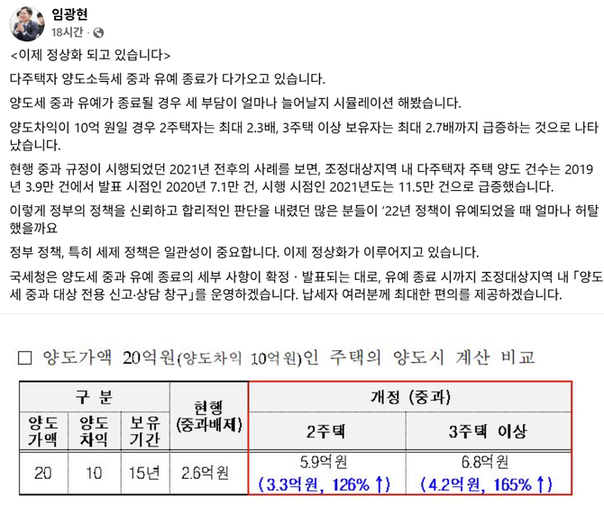 임 국세청장은 지난 3일 자신의 페이스북에 ‘이제 정상화가 되고 있습니다’는 글을 올리고 다주택자 양도세 중과 유예가 종료될 경우 세금 부담이 얼마나 늘어날지 추정수치를 올렸다.