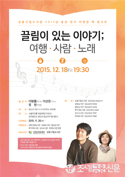 (조세금융신문=옥정수 기자) 성동문화재단(이사장 정원오) 성동구립도서관이 내달 18일 7시 30분, 소월아트홀 대공연장에서 ‘끌림이 있는 이야기; 여행·사람·노래’라는 주제로 ‘따뜻한 북 콘서트’를 개최한다.