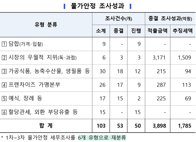 한편, 국세청은 지난해 9월부터 올해 1월까지 3차에 걸쳐 부당한 가격 인상으로 폭리를 취하며 탈세를 저지른 담합, 독・과점, 가공식품・생필품 제조, 농축수산물 유통 등 103개 업체에 대해 조사를 실시한 바 있다.