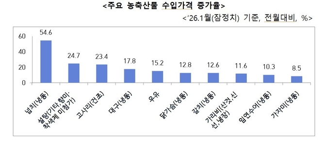 관세청이 수입가격 공개 자료를 분석한 결과, 지난 1월(잠정치) 냉동넙치 54.6%, 설탕 24.7%, 건조 고사리 23.4% 등 먹거리 수입 물품의 가격이 큰 폭으로 상승했다.