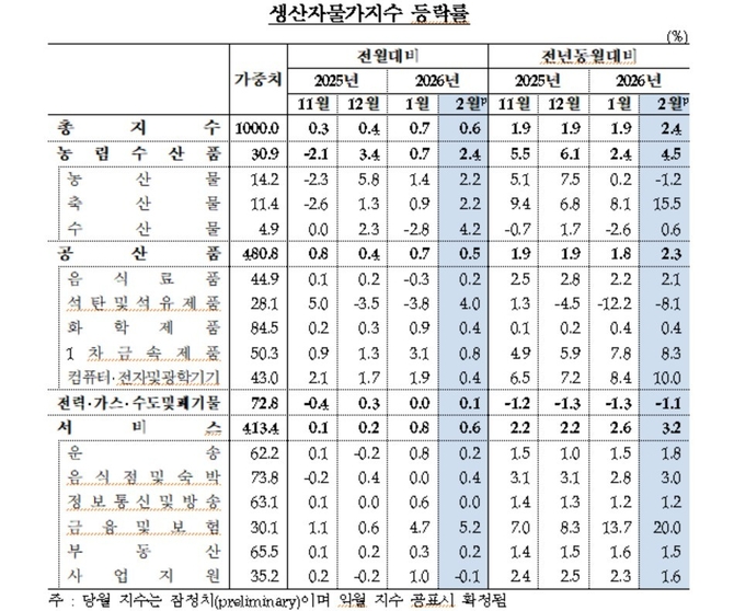 국내 출하에 수출품까지 더한 2월 총산출물가지수 역시 0.9% 올랐다. 공산품(1.1%), 서비스(0.6%)가 상승을 주도했다.