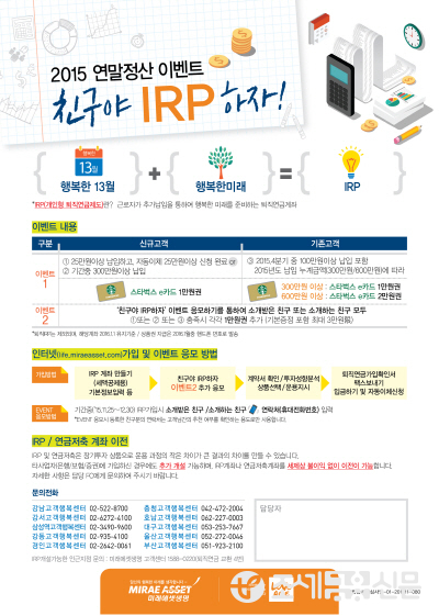 마지막으로 ‘친구야 IRP 하자’ 이벤트 응모하기를 통하여 소개받은 지인 및 소개자 모두에게 이벤트 요건 충족 시 각각 모바일 상품권 1만원권을 지급한다.