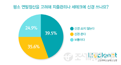 조사결과에 따르면 '평소 연말정산을 고려해 지출관리나 세테크에 신경 쓰느냐' 질문에 '신경 쓰지 않는다'고 응답한 비율이 39.5%로 1위를 차지했다.