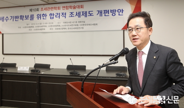 (조세금융신문=전한성 기자) 한국세법학회, 한국세무학회, 한국재정학회, 한국조세연구포럼, 한국국제조세협회가 공동으로 주최하는 '제10회 조세관련학회 연합학술대회 - 세수기반확보를 위한 합리적 조세제도 개편방안'이 4일 오후 서울 여의도 국회도서관에서 열린 가운데 강석훈 국회 기획재정위원회 조세소위원장이 축사를 하고 있다.