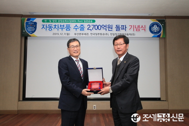 (조세금융신문=김태효 기자) 부산경남본부세관(세관장 정재열)은 한일간 자동차부품 조달에 신개념 '밀크런(Milk-Run)물류' 방식을 도입해 국내 자동차부품 수출이 4년만에 2700억원을 돌파한 공로로 해당 물류회사로부터 감사패를 전달받았다고 7일 밝혔다.
