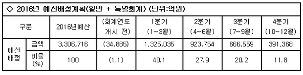 정부는 8일 오전 청와대에서 박근혜 대통령 주재로 국무회의를 열어 이 같은 내용을 담은 '2016년도 예산배정계획'을 확정했다.