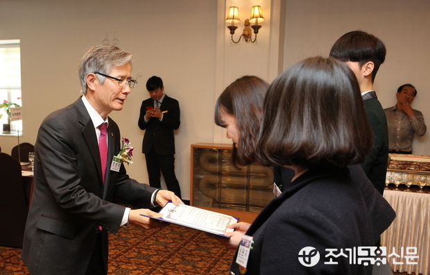 (조세금융신문=전한성 기자) '중부지방세무사회 2015년 회원 송년회'가 9일 오전 서울 서초구 더 바인에서 열린 가운데 정범식 회장이 인천세무고등학교와 경기세무고등학교 학생들에게 장학금을 전달하고 있다.
