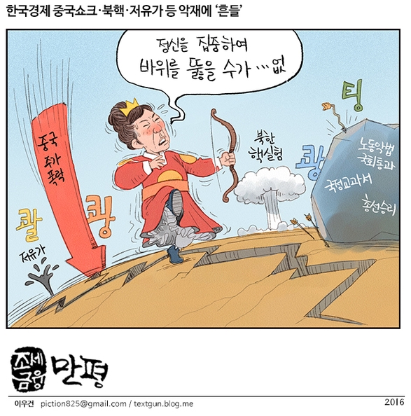 [조세금융 만평]한국경제,중국쇼크.북핵.저유가등 악재에 '흔들'