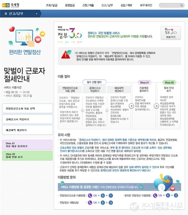 ‘연말정산 서비스’는 국세청 종합민원서비스인 홈택스(www.hometax.go.kr) 사이트에서(홈택스→연말정산→편리한연말정산) 이용할 수 있다.