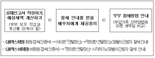 이 경우 부부 모두 연말정산간소화 서비스에서 공제받을 항목을 선택하여 ‘공제신고서 작성하기’와 ‘예상세액 계산하기’서비스를 이용한 다음, 절세 안내를 받을 배우자에게 자료제공 동의를 하면 부양가족을 공제받을 수 있는 모든 방법에 대한 결정세액과 근로자가 계산한 예상결정세액과의 차이를 계산해 맞벌이 근로자 부부 세부담 합계가 최소화되는 방법을 안내해 준다.
