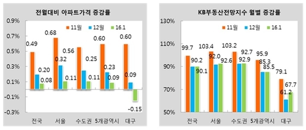 특히 대구지역은 지난해 11.24%의 높은 연간 상승률을 보이며 전국적인 상승세를 주도하였으나, 1월들어 0.15% 하락하며 2010년 7월 이후 65개월 연속 상승하는 기록적인 상승을 마감하고 하락세로 접어들었다.