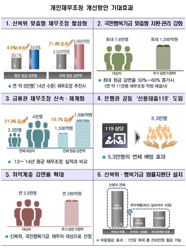 개인채무조정 개선방안에 따르면 우선 신용회복위원회(신복위) 워크아웃 과정에서 이뤄지는 채무조정은 채무자의 상환능력에 맞춰 원금감면율이 현행 50%에서 30~60%로 바뀐다.