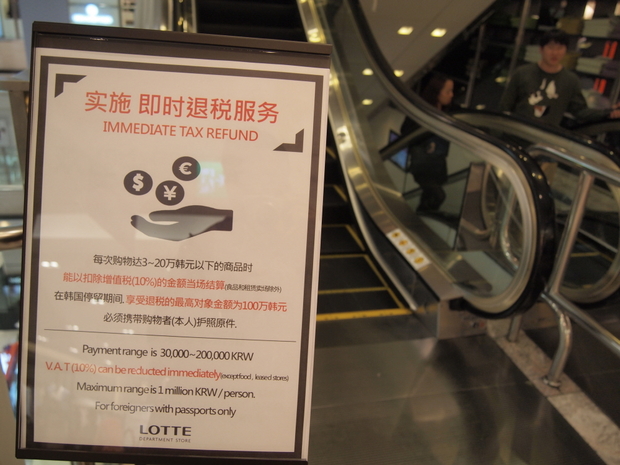 (조세금융신문=김태효 기자) 롯데와 신세계, 현대 등 주요 백화점과 대형마트가 1일부터 외국인에게 부가세를 즉시 환급하는 ‘외국인 즉시 환급 서비스’를 도입했다. 즉시 환급 서비스는 외국인이 건당 3만원 이상, 20만원 미만의 물건을 살 때 매장에서 바로 부가세 10%를 제외한 금액으로 결제할 수 있는 제도로 100만원 한도 내에서 혜택을 받을 수 있다. 기존에는 외국인 관광객이 부가세 환급을 받으려면 일일이 전표를 모은 뒤 출국할 때 제출해야 환급이 가능했다. 사진은 이날 오후 서울 중구 소공동 롯데백화점 본점에 즉시환급제 안내문이 게재 되어 있는 모습.