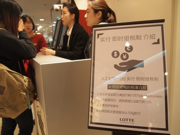 (조세금융신문=김태효 기자) 롯데와 신세계, 현대 등 주요 백화점과 대형마트가 1일부터 외국인에게 부가세를 즉시 환급하는 ‘외국인 즉시 환급 서비스’를 도입했다. 즉시 환급 서비스는 외국인이 건당 3만원 이상, 20만원 미만의 물건을 살 때 매장에서 바로 부가세 10%를 제외한 금액으로 결제할 수 있는 제도로 100만원 한도 내에서 혜택을 받을 수 있다. 기존에는 외국인 관광객이 부가세 환급을 받으려면 일일이 전표를 모은 뒤 출국할 때 제출해야 환급이 가능했다. 사진은 이날 오후 서울 중구 소공동 롯데백화점 본점 안내데스크에서 직원이 관광객들에게 즉시환급제 안내를 하고 있는 모습.