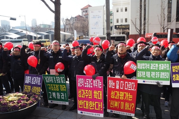 홍완엽 금융노조 수석부위원장은 “성과연봉제의 효과에 대한 연구는 없는 반면 폐해에 대해서는 대한상의, 삼성경제연구소, 노동부 등 많은 연구 보고서가 있다”면서 “그럼에도 정부가 성과연봉제를 확대시키려는 것은 ‘저성과자 퇴출’을 위한 것”이라고 비판했다. 또 “이를 막지 못하면 조합원도 죽고 노동조합도 죽는다”면서 “금융노조는 올해 임단협에서 총파업을 불사하는 강력한 투쟁으로 반드시 저지해낼 것”이라고 목소리를 높였다.
