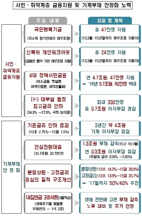 금융위원회는 가계부채 문제를 지속 관리하기 위해 앞으로도 ▲상환능력 제고를 위한 소득증대 ▲가계부채의 안정적 관리 ▲서민·취약계층 지원 등 종합적이고 일관되게 문제 대응에 나서기로 했다.