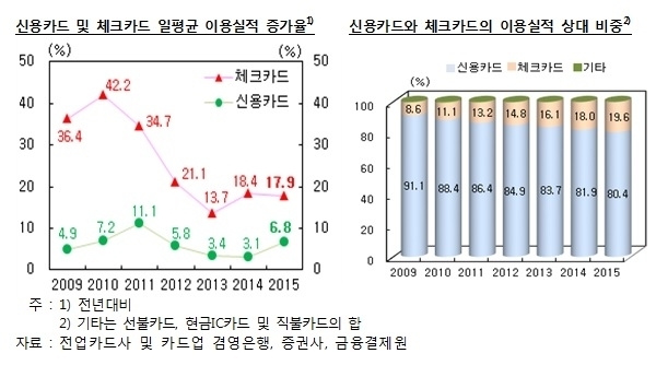세제혜택 확대 및 신용카드와 유사한 부가서비스 제공 등이 영향을 준 것으로 보인다. 신용카드 소득공제율은 15%로 동일한 반면 체크카드 사용액 증가분에 대한 소득공제율은 2014년 최대 40%에서 지난해 50%로 확대됐다.
