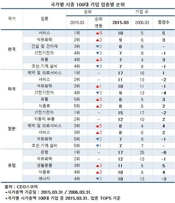 시총 100대 기업내 한국의 1등 업종은 10년 전 조선기계설비, 건설 건자재 등 굴뚝산업에서 포털 게임 등 내수 중심의 지식기반 서비스산업으로 확 바뀌었으나 미국은 제약·의료서비스, 일본은 IT전기전자와 자동차. 유럽은 은행 관련 산업이 10년전과 마찬가지로 1등 업종으로 입지를 굳히고 있다.