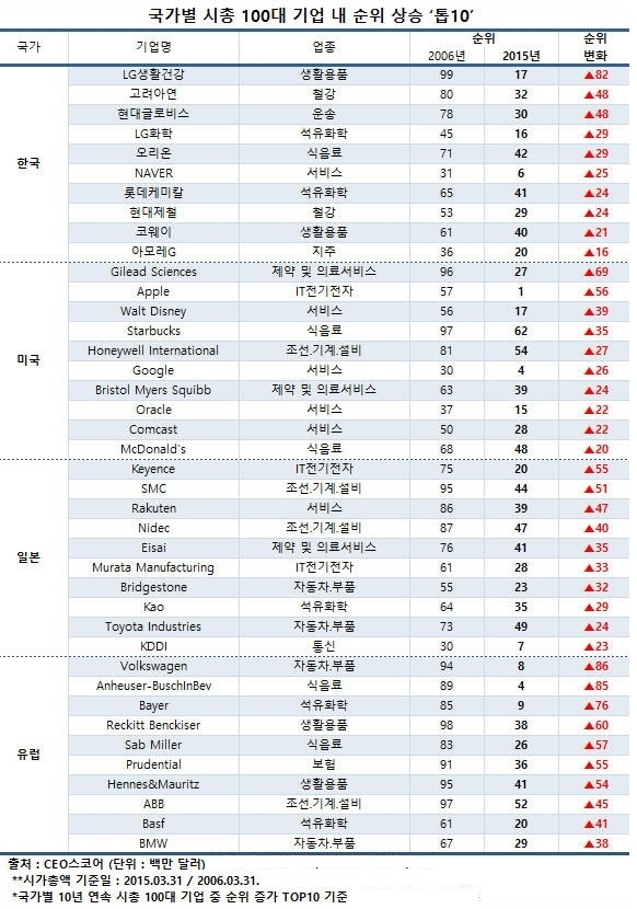 각국 기업별로 10년동안 시총 순위가 가장 크게 오른 곳은 한국 LG생활건강, 미국 길리어드 사이언스(제약사), 일본 키엔스(측정기기 제조), 유럽 폭스바겐 등이었다.
