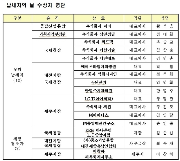 이날 행사에서는 세금을 성실히 납부하고 국가재정에 크게 기여한 모범납세자 13명과 세정협조자 3명이 훈장 및 표창을 수상했다.