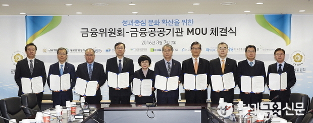 임 위원장은 이날 산업은행, 기업은행, 수출입은행, 예금보험공사, 신용보증기금, 기술신용보증기금, 주택금융공사, 자산관리공사, 예탁결제원 9개 금융공공기관장과 성과주의를 조기에 도입할 경우 예산 등의 인센티브를 제공하되 불이행시 인사, 예산상 책임을 묻기로 하는 내용의 성과중심 문화 확산 이행을 위한 MOU를 체결했다.