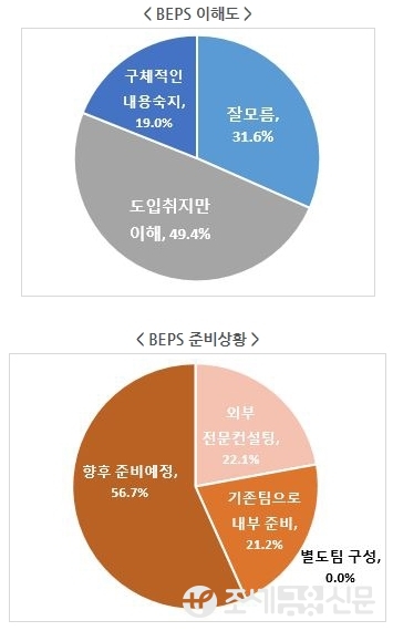 전경련은 특히 2015년 신설된 국제거래정보통합보고서 제출 대상인 매출액 1000억 초과 또는 국외특수관계인간 거래 500억 초과 기업 108개를 대상으로 한 추가 설문의 경우, 기업 10곳 중 5곳이 BEPS에 대해 ‘향후 준비 예정’이라 답하는 등 아직까지 BEPS에 대한 준비가 충분히 이뤄지지 못하고 있는 상황이라고 설명했다.