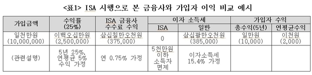1천만 원을 5년간 ISA통장에 넣고 연평균 5%의 수익(5년간 25%)을 얻는다는 가정과 금융사에 년 0.75% 수수료를 지급한다고 하는 경우, ISA통장 가입자는 5년간 1만 원의 수익을 보게 되고 이는 매년 2천 원 이익을 받는 상품이다. 이게 부자 만드는 상품이라는 말인가?