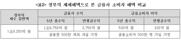 반면 금융사는 5년간 1조8,750억 원, 연간 3,750억의 수익을 거둬가는 것으로 추정된다. 이는 금융소비자가 5년간 얻는 이익이 5백억 원, 연간 100억 원의 혜택을 받는 것과 비교해 금융사가 국민의 수익대비 40배 정도의 수익을 가져가는 구조이다. 정부의 세제 혜택을 거의 전부 금융사가 이익으로 가져가는 제도이다.