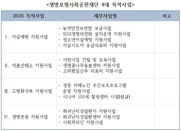 올해 재단 설립취지와 생명보험의 특성을 반영해 최근 대두되고 있는 사회문제에 맞춰 그동안 추진해 온 7대 목적사업에서 ▲자살예방지원사업 ▲저출산해소 지원사업 ▲고령화극복 지원사업 ▲생명존중 지원사업 등 4가지 사업으로 재편 추진하겠다고 밝혔다.