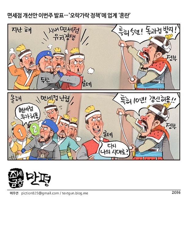 [조세금융 만평]면세점 개선안...'오락가락 정책'에 업계 혼란