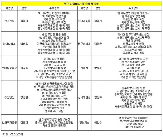 이 밖에 30대 그룹 계열사가 올해 신규 선임한 국세청 출신 사외 이사는 롯데칠성음료 채경수 사외 이사(전 서울지방국세청장), 두산엔진 강성원 사외 이사(현 한국공인회계사회 회장), 한화투자증권 김용재 사외 이사(현 이현세무법인 총괄부회장), 현대홈쇼핑 김영기 사외 이사(현 세무법인 티엔피 대표), 인터지스 이인수 사외 이사(현 세무법인 인성 대표) 등이다.