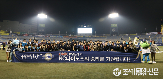 (조세금융신문=양학섭 기자)BNK금융그룹 경남은행이은 홈에서 벌인 NC다이노스를 응원했다. BNK금융그룹 경남은행은 지역 연고 프로야구구단의 선전을 기원하기 위해 ‘CEO와 함께하는 NC다이노스 개막전 관람행사’를 가졌다.