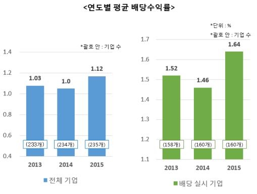 전국경제인연합회(이하 전경련)가 상호출자제한기업집단 소속 235개 상장계열사1)들의 공시 자료를 분석한 결과에 따르면, 235개 기업의 올해 평균 배당수익률은 1.12%로, 전년(1.0%)대비 0.12%p 증가했다.