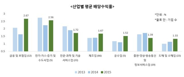 산업별로 평균 배당수익률을 살펴보면, 금융 및 보험업이 2.67%로 가장 높았고, 전기·가스·증기 및 수도사업(2.56%), 전문·과학 및 기술 서비스업(1.72%), 제조업(1.67%)등의 순이었다.
