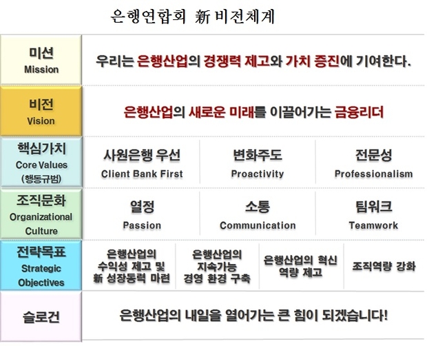 은행연합회는 “은행산업의 수익성 악화와 핀테크의 확산 등 급격한 금융환경 변화에 맞춰 은행연합회가 개방적이고 창의적인 조직으로 거듭날 수 있도록 연합회 내부 소통위원회, 부서장 토론 등을 거쳐 은행연합회의 새로운 비전을 마련했다”고 밝혔다.