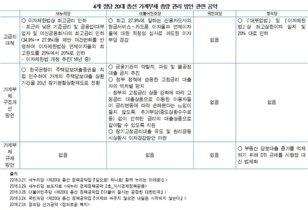 참여연대는 “4개 정당 공히 가계부채가 늘어나는 구조적인 원인과 이를 조절·규제하는 효과적인 방안을 두루 제시하고 있다고 평가하기 어렵다”고 총평했다.
