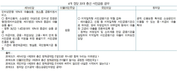 새누리당의 공약에 대해 “많은 우려를 낳고 있는 인터넷 전문은행·서민금융진흥원 공약으로 부적절”하며 더불어민주당의 공약에서 “‘10%대 우체국 신용대출’을 발표한 바 있으나 후에 발표된 공약집에서는 제외”되었으며, 국민의당의 공약은 “직접적인 지원 제시했지만 부분적이고 구체적인 내용이 부족”하고, 정의당의 공약에 대해서는 “원론적인 수준 제시하여 공급수준과 재원마련 방안 등 구체적인 내용 부족”하다고 평가했다.