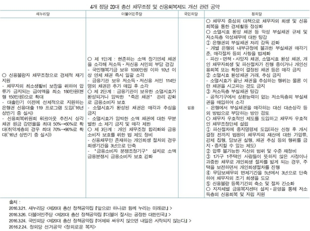 파산 상태에 처한 가계를 위한 채무자 친화적인 채무조정제도(개인파산과 개인회생제도 포함)를 마련하고 있는지 4개 정당의 ‘채무조정 및 신용회복제도’ 개선 방안과 관련해서, 새누리당은 “‘빚을 끝까지 받아내는 정책’ 일변도에서 벗어나 집권당으로서 책임감을 가지고 더욱 과감한 빚탕감 정책을 제시할 필요 있다”고 지적하고 “기본적으로 대출을 확대하는 방향이라 바람직하지 않고, 실질적인 개선효과를 볼 수 없다”고 평가했다.