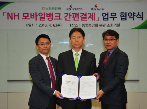 NH모바일뱅크는 고객이 간편인증을 통해 간편송금, 간편대출, 간편결제 등 금융 및 핀테크 서비스를 이용할 수 있으며, 이번 간편결제 서비스 개발을 위해 KG모빌리언스, KG이니시스와 6일 ‘NH모바일뱅크 간편결제 서비스 개발을 위한 업무협약’을 체결했다.