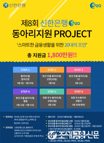 (조세금융신문=김사선 기자) 신한은행은 20대 청춘의 소중한 꿈을 공유하고 뜨거운 열정을 나누기 위한 제8회 ‘S20 동아리지원 프로젝트’를 진행한다고 8일 밝혔다.