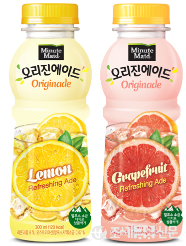 미닛메이드 오리진에이드는 깔끔하고 상큼한 맛의 레몬과즙을 함유한 ‘오리진에이드 레몬’과 달콤쌉싸름한 자몽의 맛을 느낄 수 있는 ‘오리진에이드 자몽’ 두 가지로, 레몬과 자몽의 느낌을 그대로 반영한 노란색과 핑크색의 용기 디자인으로 출시됐다.